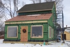 The windows are being covered with plastic sheets to protect the interior and to keep the home warm enough to continue working through the cold months ahead.
